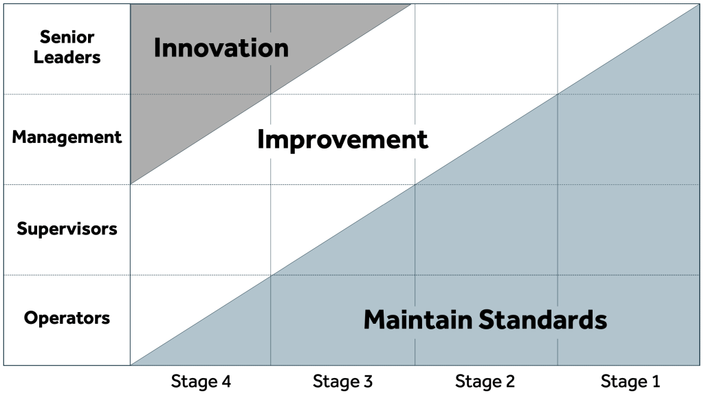 In stage 4, the senior leaders have the time to focus almost solely on innovation, your middle managers do innovation & improvement, your supervisors do improvement and your workforce take part in improvement and maintaining the standards.